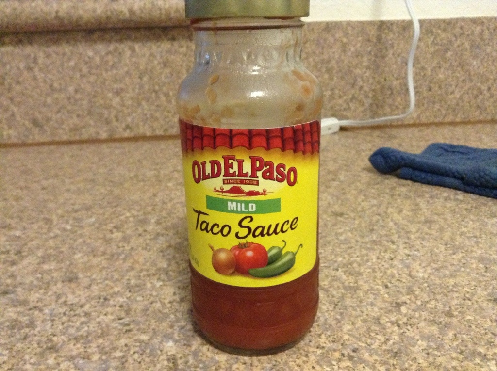The first ingredient I start with is 1 package of cream cheese. I used light cream cheese this time but usually I try to stay away from light or low fat items. These items tend to be jam packed with chemical substitutes. Spread the softened package of cream cheese on the pie plate. Next, pour about 8 oz of taco sauce on top of the cream cheese. Here is the sauce I used