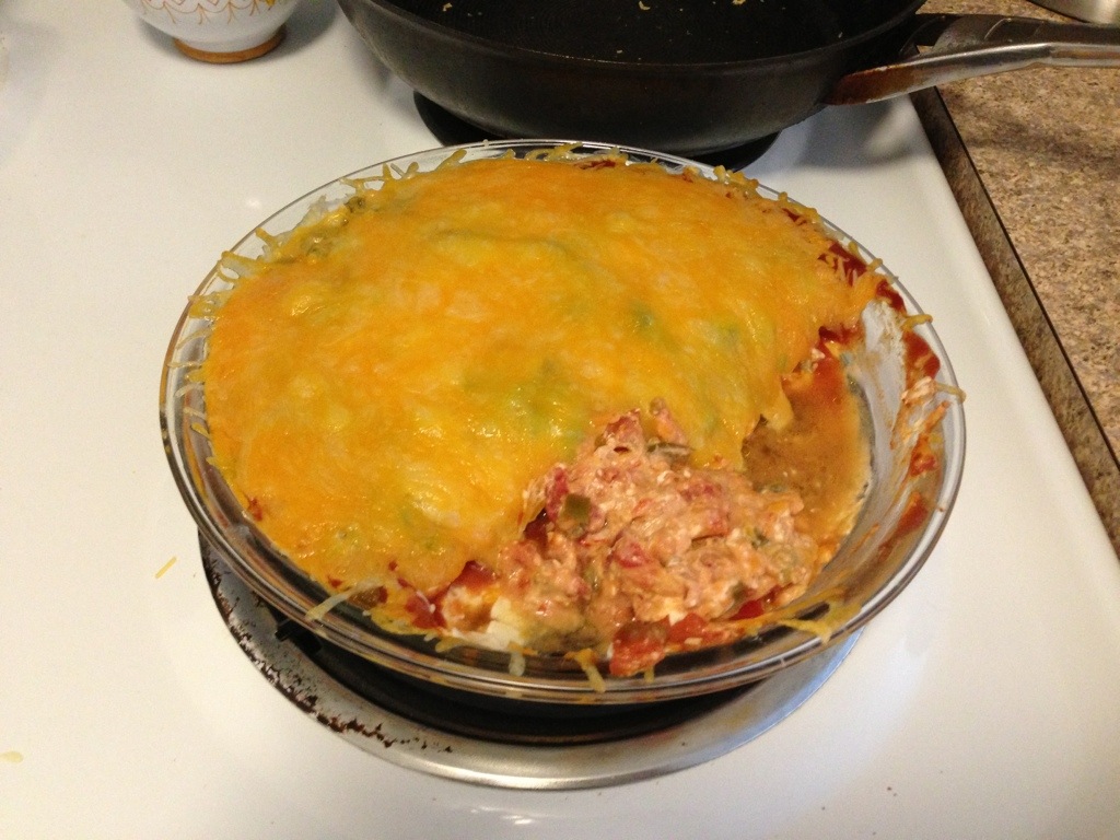 Spread a large amount of cheese over the top. Don’t be shy with it! Place the entire dish in the oven until the cheese melts (time will vary by oven). Take dish out of the oven and this is what you should get