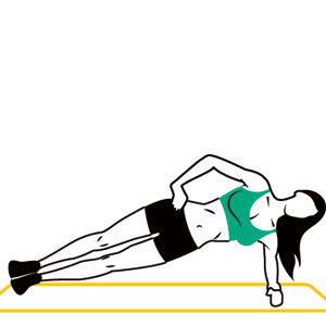 Lie on your side. Make sure one leg is on top of the other. Position your forearm on the floor perpendicular with your body. Use your forearm to lift your upper body off the ground. The other arm is placed on the side of your body. Hold for as long as possible.