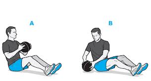 Sit down with your feet flat on the mat. Your knees should be bent. Lean back slightly. Position your hands together and keep your hands in this position for the rest of the movement (you can also hold a light dumbbell or medicine ball for more advanced exercise). Your arms should be perpendicular with your upper body. Twist your torso in one direction. Hold for one second. Twist your torso in the other direction. Hold for one second. This is one repetition.