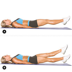 Lie down on the floor. Place hands next to your sides. Extend legs fully and slightly elevated. While keeping legs straight, raise one leg up. As you lower leg, raise the other leg up. This is one repetition.
