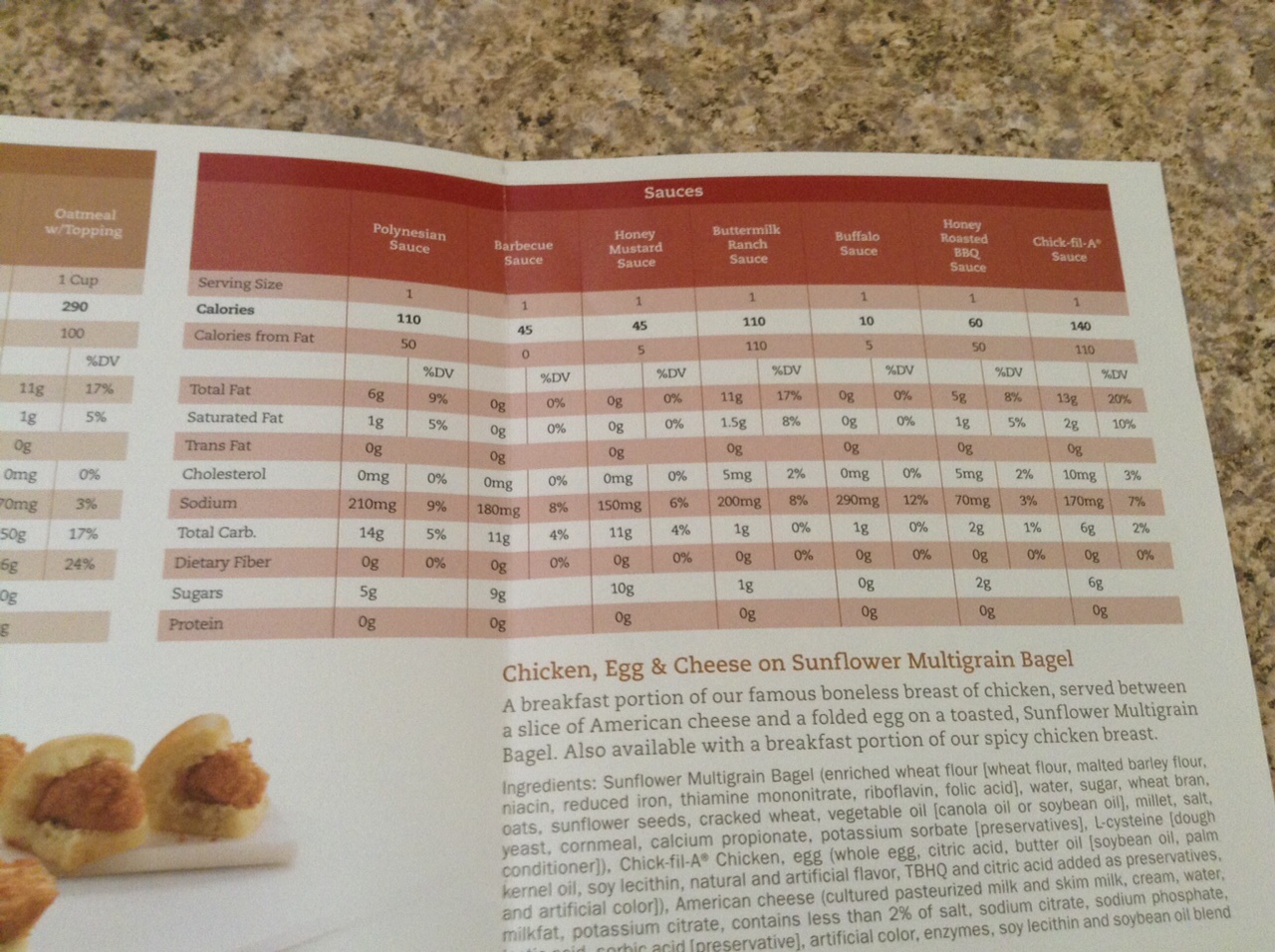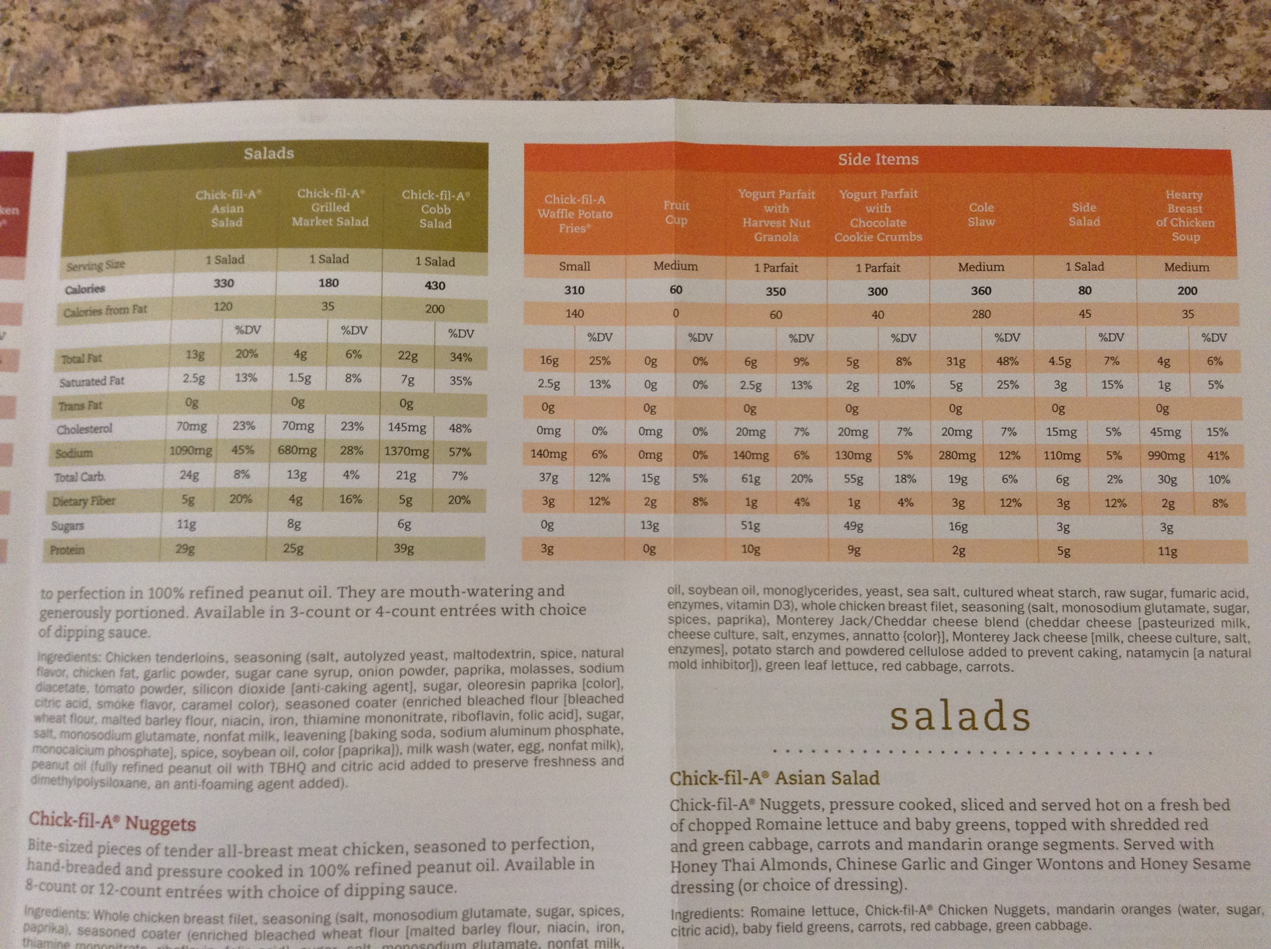 There is however a better alternative to McD’s, Burger King or even Long John Silver (please for the love of god if you eat here, STOP. it was rated as having THE worst fast food items ever!). Chick-Fil-A is a favorite spot of our family. First, its chicken, who doesn’t love chicken? Second, if you take a look at the caloric value, it’s really not as bad as the rest of them. Ok, so where DO I get the nutritional information you may ask? Well right here! I found a pamphelt while chowing down on some nuggets the other day and took the liberty of taking a few photos to share with everyone.