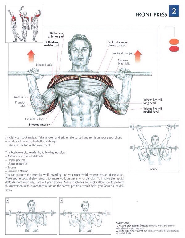 These can be done with either a barbell, dumb bells or at the cable machine. They work all three parts of the shoulder. Start with a lower weight to assess how well you can perform the exercise before adding more weight. Aim for 8-10 reps for each of these exercises.